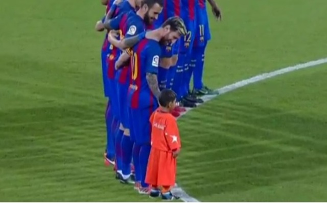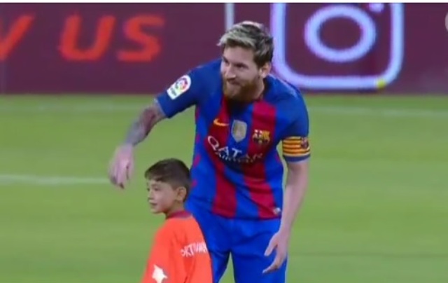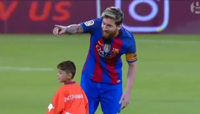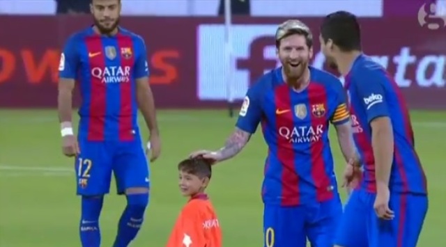 الدوحة - بقطر، وخرج الصبي مُمسكاً بيد ميسي عند نزوله إلى أرض الملعب ليلة الثلاثاء، في مباراة برشلونة والنادي