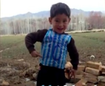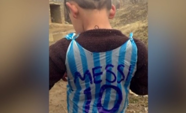 مرتضى أحمدي البالغ من العمر خمسة أعوام، وهو يرتدي كيساً بلاستيكياً مخططاً باللون الأبيض والأزرق، في محاولة منه لمُحاكاة ألوان قميص الفريق الأرجنتيني. وعلى ظهر الكيس البلاستيكي، كُتِب اسم