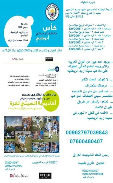 وقال رئيس الاتحاد طارق طعيمة في حديث لـ السومرية نيوز، إن "الاتحاد تلقى دعوة رسمية للمشاركة في البطولة الدولية للأكاديميات التي ينظمها نادي مانشستر سيتي الإنجليزي في مدينة أبو ظبي بالإمارات خلال شهر آذار المقبل"، مبينا أن "أخر يوم للتسجيل هو الأول من آذار المقبل".