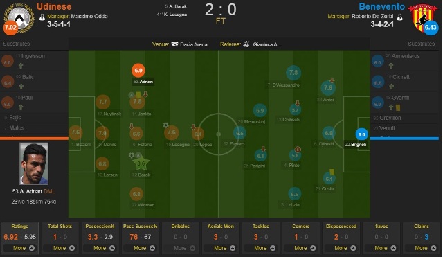 وتغلب اودينيزي، أمس الاحد، على ضيفه بينفينتو بهدفين دون رد في الجولة السادسة عشر من الكالتشيو الايطالي، حيث شارك عدنان اساسياً في المباراة ولعب لمدة 90 دقيقة كاملة.