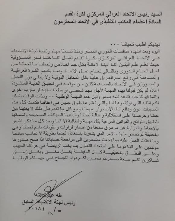 أكد رئيس لجنة الانضباط في اتحاد الكرة طه عبد حلاته، أن اللجنة تشعر بالإحباط من القرارات و العقوبات التي أصدرها الاتحاد لم تخرج من لجنة الانضباط بتاتاً، مبيناً أنه تم استغلال لجنتنا بطريقة لا تتناسب و مبادئنا و العمل المهني الذي اعتدنا عليه.