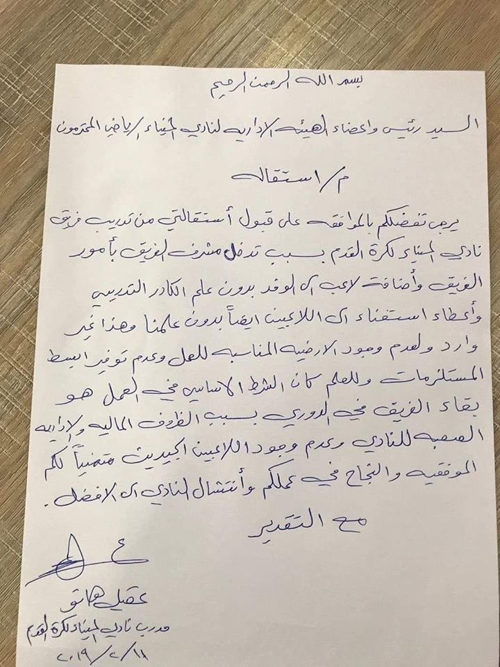 بالوثيقة.. عقيل هاتو يقدم استقالته من تدريب الميناء