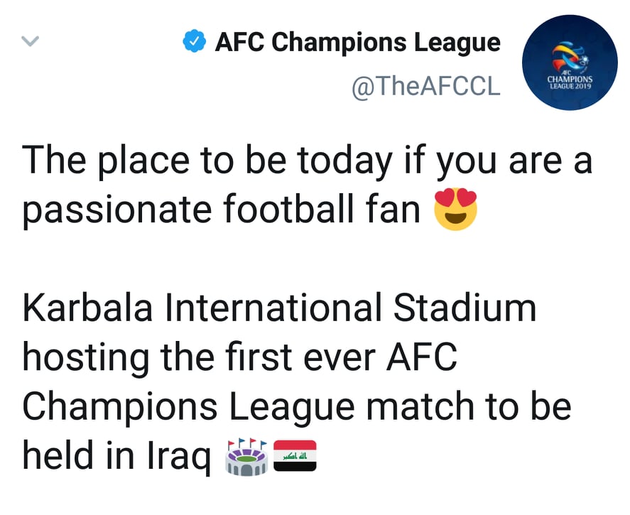 الاتحاد الاسيوي حين نشر في تغريدة: "المكان المناسب اليوم، ان كنت من عشاق كرة القدم.. ملعب