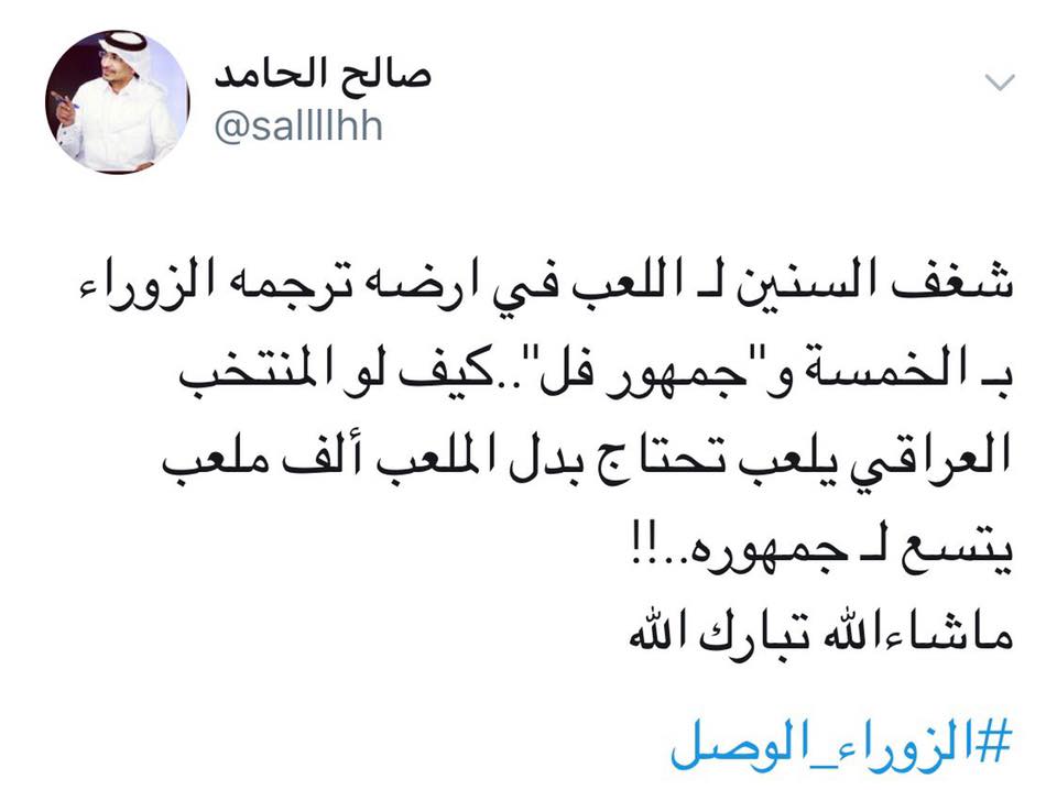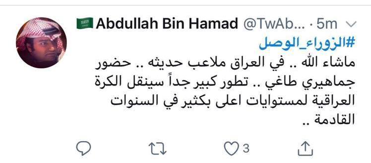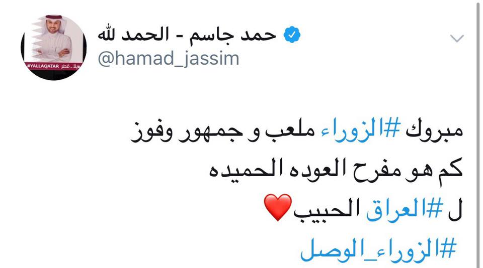 القطري صالح الحامد غرد قائلاً: "شغف السنين للعب في ارضه، ترجمه الزوراء بالخمسة و"جمهور فل"..كيف لو المنتخب العراقي يلعب، تحتاج بدل الملعب ألف ملعب يتسع لـ جمهوره..!!"، مواطنه الاعلامي حمد الجاسم كان له رأي ايضاً حين غرد: "مبروك الزوراء، ملعب وجمهور وفوز، كم هو مفرح العودة الحميدة للعراق الحبيب".