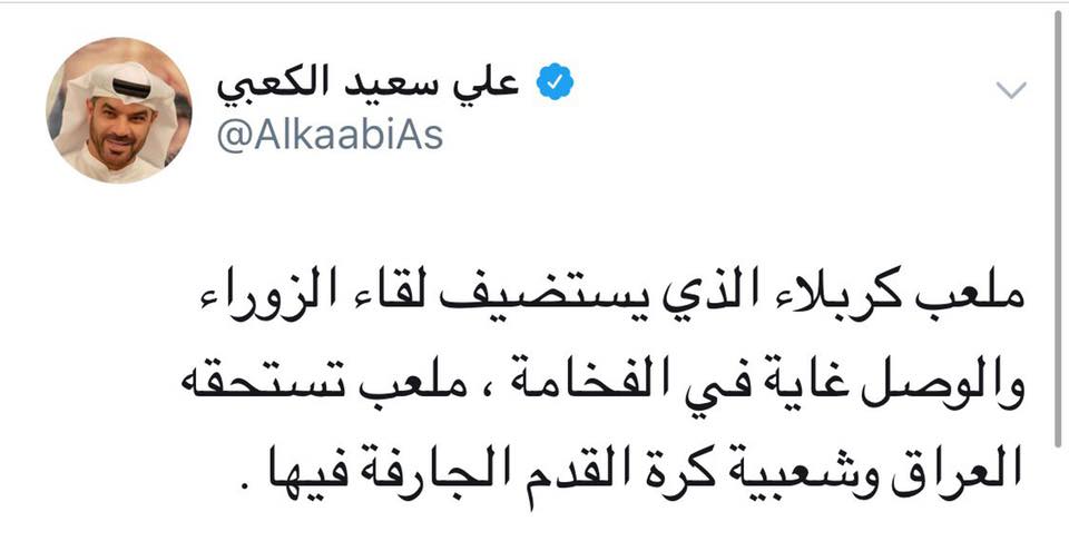 الكعبي غرد قائلاً: "ملعب كربلاء الذي يستضيف لقاء الزوراء والوصل غاية في الفخامة، ملعب تستحقه العراق وشعبية كرة القدم الجارفة فيها"، اما الاعلامي