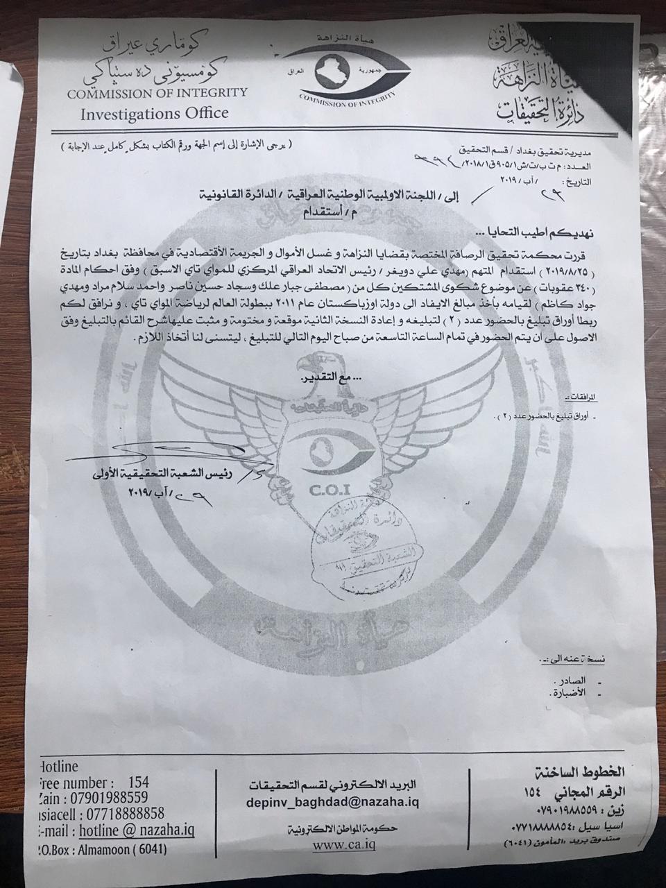 قررت محكمة تحقيق الرصافة المختصة بقضايا النزاهة وغسل الاموال والجريمة الاقتصادية في محافظة بغداد، استقدام رئيس اتحاد المواي تاي السابق، مهدي علي دويغر، بتهمة اختلاس اموال الايفاد الى دولة اوزباكستان للمشاركة في بطولة العالم للمواي تاي 2011.