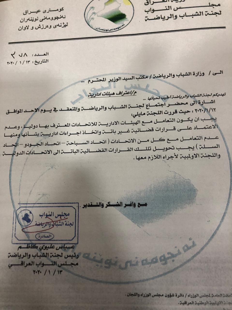 وتم اعلام الوزارة بكتاب رسمي صادر من اللجنة البرلمانية، للتعامل مع الهيئات الادارية برئاسة كل من سمير الموسوي وسرمد عبدالاله وحسين العميدي.