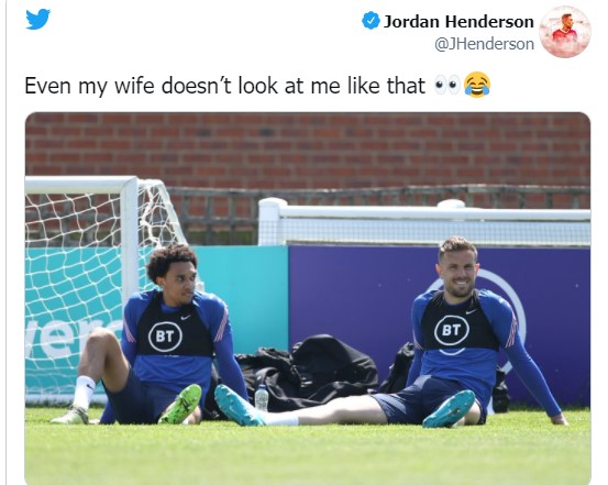 ونشر هندرسون صورة مشتركة للاعبين التقطت لهما في المعسكر التدريبي لمنتخب "الأسود الثلاثة" قبل انطلاق كأس أوروبا يورو 2020 وعلق عليها:"حتى زوجتي لا تنظر إلى هكذا".