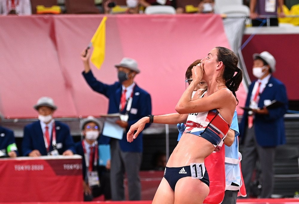 انهارت العداءة البريطانية جيسيكا جود من الإرهاق والتعب، وسعت للحصول على الماء بعد نهاية منافستها في سباق عشرة آلاف متر في أولمبياد طوكيو، في ظل درجة حرارة بلغت 90 درجة فهرنهايت (32 درجة مئوية) و80% من الرطوبة.