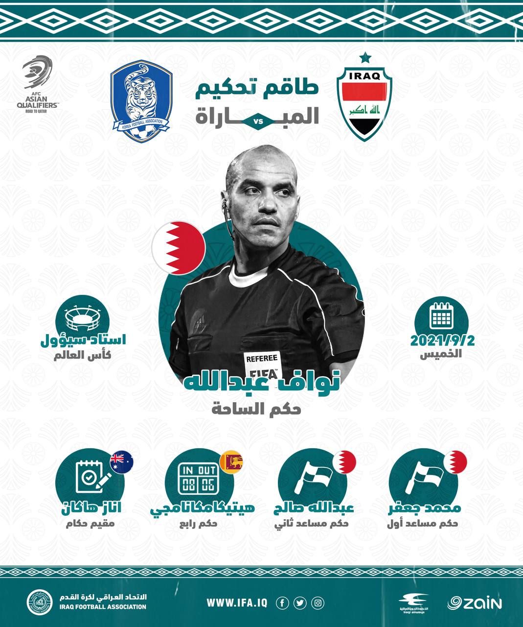 طاقم تحكيم بحريني لقيادة مباراة منتخبنا أمام كوريا الجنوبية في التصفيات الآسيوية