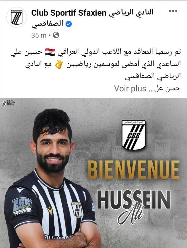 أعلن نادي الصفاقسي التونسي، اليوم السبت، التعاقد بشكل رسمي مع الدولي العراقي حسين علي، الذي أمضى لموسمين لفائدة فريق عاصمة الجنوب.