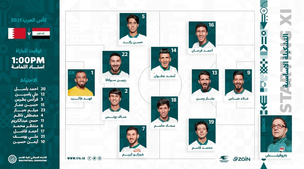 تنشر السومرية نيوز، تشكيلة منتخبنا الوطني لمواجهة نظيره البحريني في كاس العرب.