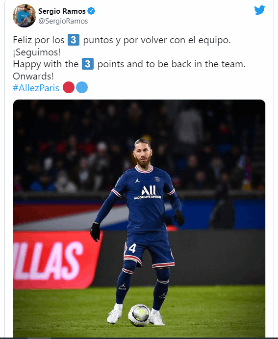 وكتب راموس عبر حسابه الشخصي بموقع "تويتر": "سعيد بالنقاط الثلاث وعودتي للفريق.. إلى الأمام".
