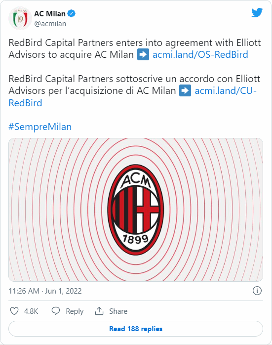 و‬‬أعلن نادي ميلان في بيان نشره على موقعه الرسمي أن مؤسسة "ريدبيرد كابيتال بارتنرز" الأمريكية للاستثمار توصلت إلى اتفاق بقيمة 1.2 مليار يورو "1.3 مليار دولار أمريكي" لشراء النادي، على أن يحتفظ بنك "إليوت"، المالك الحالي، على حصة أقلية من أسهم النادي.