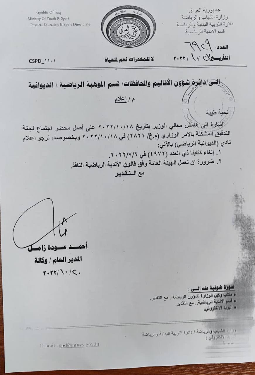 الغاء كتاب تشكيل هيئة مؤقتة لإدارة نادي الديوانية (وثيقة)