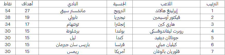 بعد انتصاف الموسم الحالي بقليل، لا يزال هالاند متشبثًا بصدارة سباق الحذاء الذهبي بـ27 هدفًا (54 نقطة) ويأتي من خلفه النيجيري فيكتور أوسيمين من نابولي الإيطالي بـ19 هدفًا (38 نقطة).