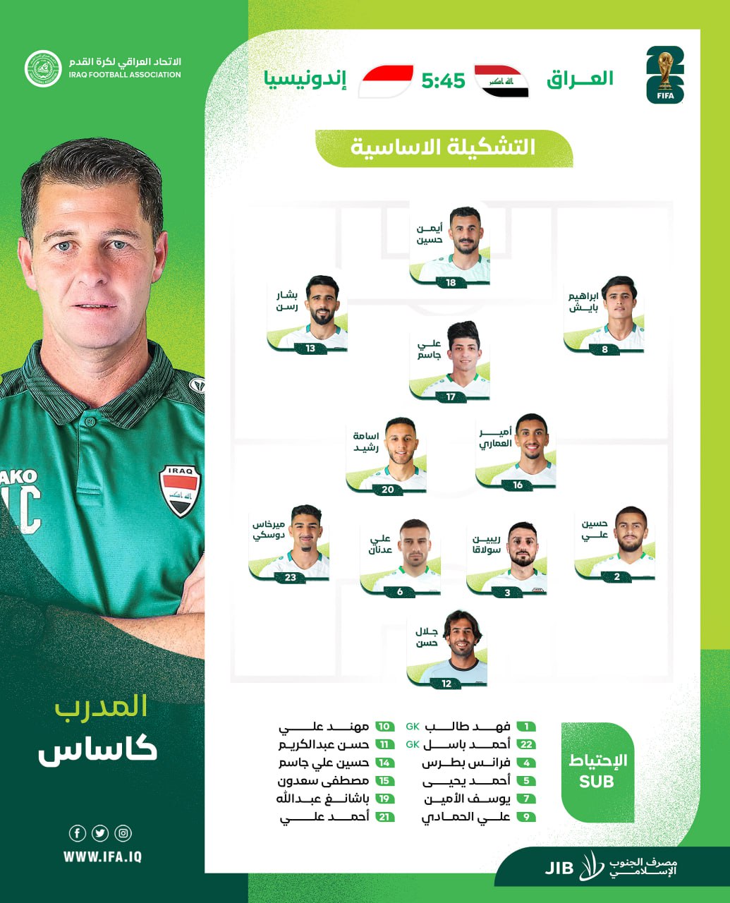 تنشر وكالة السومرية نيوز، تشكيلةُ المنتخب الوطنيّ أمامَ نظيره الإندونيسيّ التي تقام اليوم الخميس في ملعبِ البصرة الدوليّ الساعة 5،45.