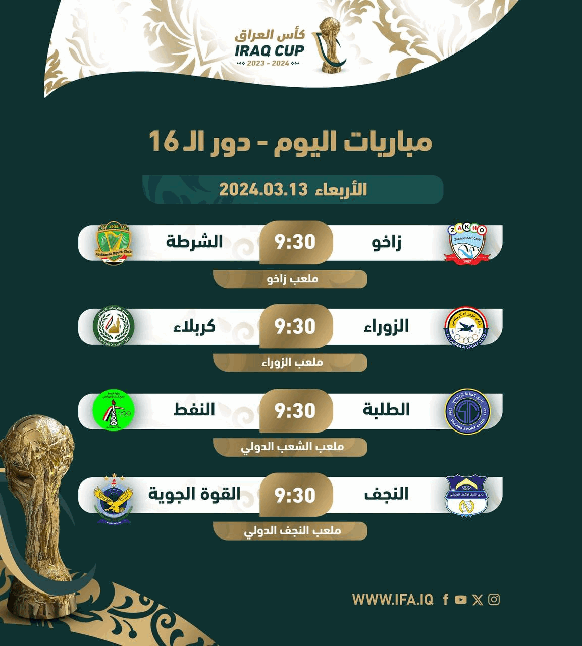 يدشِّن فريق القوة الجوية لكرة القدم اليوم الأربعاء حملة الدفاع عن لقب الكأس المتوج به في آخر نسخة عندما يحل ضيفاً على النجف، ويقود اللقاء الطاقم التحكيمي الأردني المؤلف من أدهم المخادمة وأحمد مؤنس ومحمد البكار، إضافة إلى زيد ثامر.
