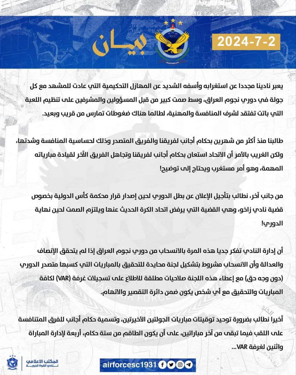 العراق إذا لم يتحقق الإنصاف والعدالة وأن الانسحاب مشروط بتشكيل لجنة محايدة للتحقيق بالمباريات التي كسبها متصدر الدوري (دون وجه حق) مع إعطاء هذه اللجنة صلاحيات مطلقة للاطلاع على تسجيلات