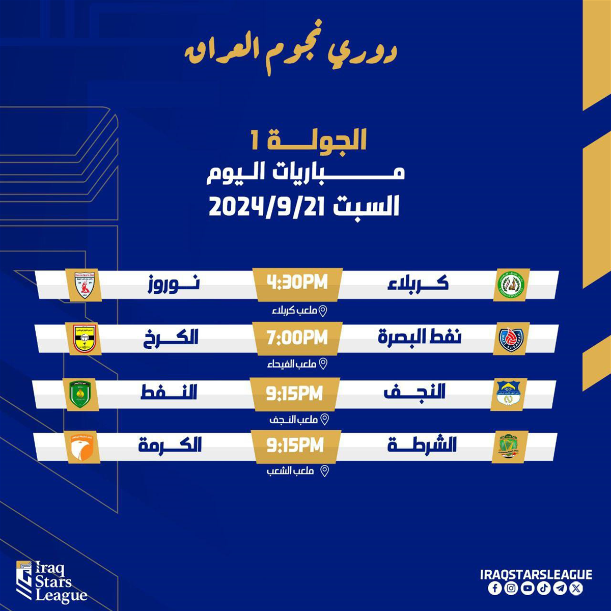 تجرى اليوم السبت، 4 مواجهات ضمن منافسات الجولة الأولى لدوري نجوم العراق لكرة القدم على ملاعب بغداد والبصرة والنجف وكربلاء.