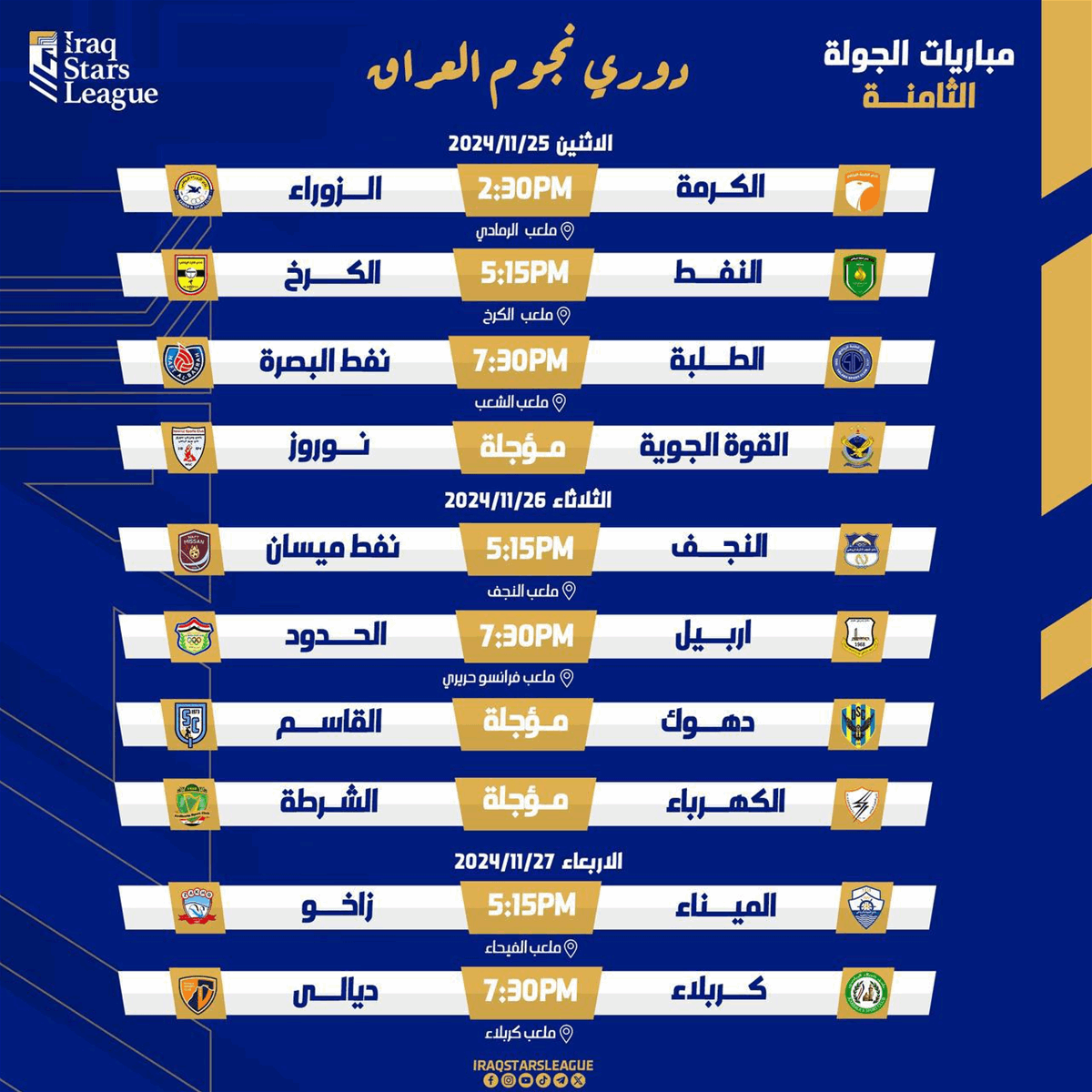 تنطلق يوم الاثنين المقبل منافسات الجولة الثامنة من دوري نجوم العراق لكرة القدم للموسم الحالي(2024-2025).