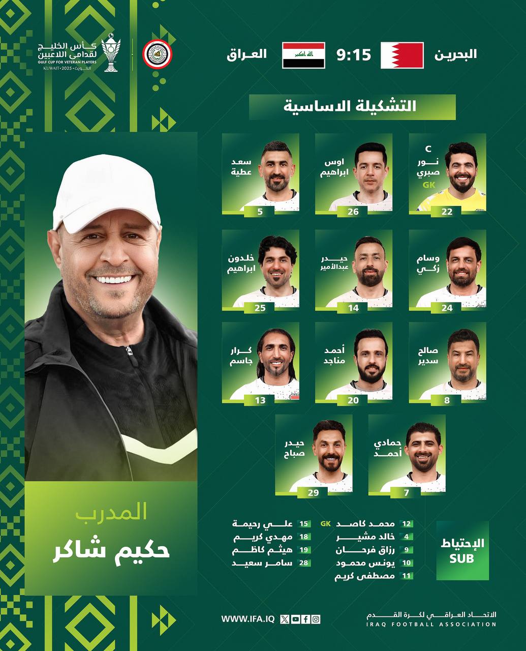 اعلن المدير الفني لمنتخبنا الوطني لقدامى اللاعبين، حكيم شاكر، اليوم الاحد، عن التشكيلة الرسمية لمواجهة البحرين ضمن بطولة الخليج في الكويت.