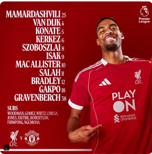 التشكيلة الأساسية لمواجهة ليفربول ضد مانشستر يونايتد