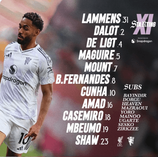 يونايتد: لامينس، دي ليخت، شاو، ماغواير، دالوت، كاسيمرو، أماد ديالو، فرنانديز، مبيومو، مونت، ماتيوس كونيا.