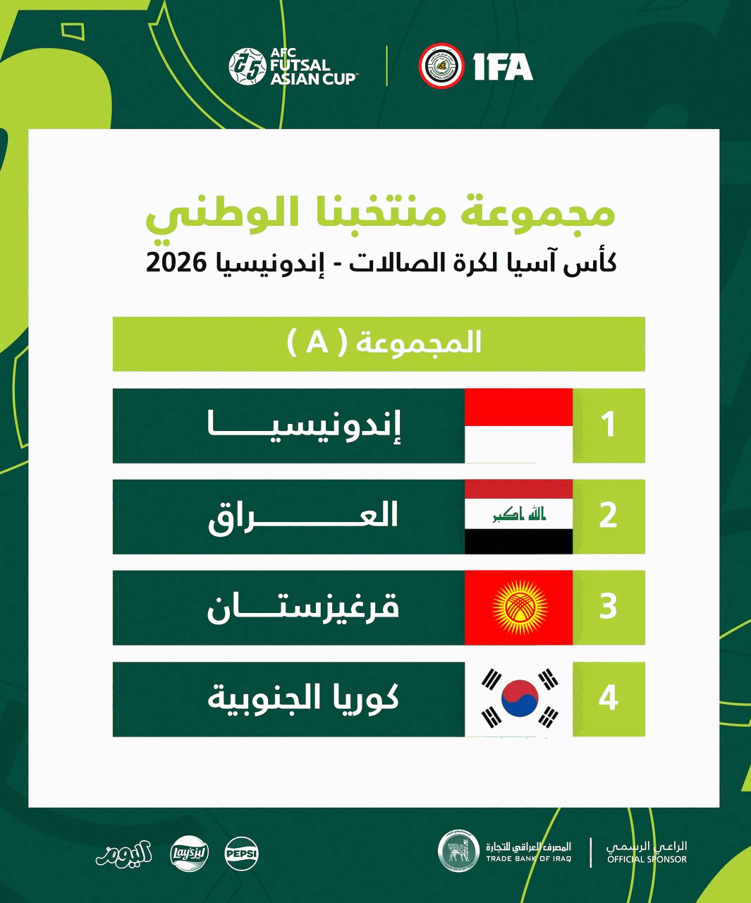 قرعة كأس آسيا للصالات تضع العراق في مواجهة إندونيسيا وكوريا الجنوبية