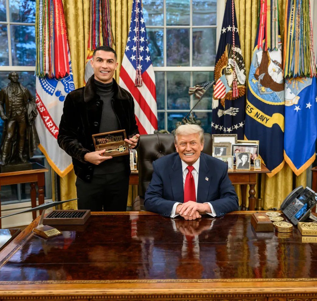 تناقلت مواقع التواصل الاجتماعي صورا لاجتماع عقد بين الرئيس الأمريكي دونالد ترامب والأسطورة البرتغالي قائد النصر السعودي كريستيانو رونالدو مع جورجينا رودريغيز.