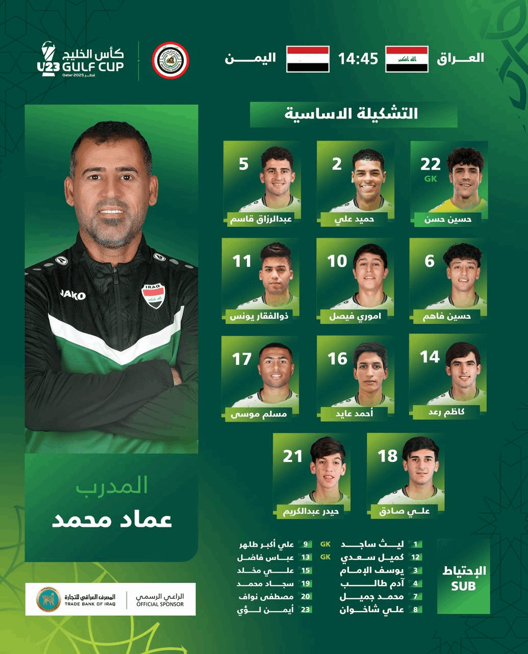 كأس الخليج تحت 23 عاماً: تشكيلة المنتخب الأولمبي العراقي لمواجهة اليمن