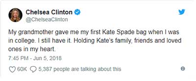 كلينتون، شالسا، التي علّقت على خبر وفاة كايت بالقول: "جدتي أهدتني أول حقيبة من Kate Spade New York حين كنت في المدرسة، عائلة كايت واصدقاءها دائما في قلبي".