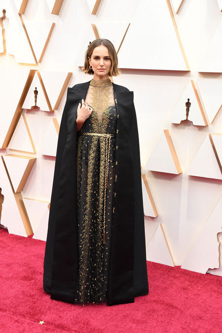 إطلالة أنيقة وملفتة ظهرت بها النجمة ناتالي بورتمان Natalie Portman على السجادة الحمراء من ديور، عبارة عن فستان باللون الأسود مطرز باللون الذهبي، كما ارتدت فوقه معطف باللون الأسود.