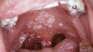 بعدها طفح على شكل لطخة بيضاء أو حبوب صغيرة أو خطوط رقيقة على شكل شبكة تغطي مناطق من اللسان والخدين من الداخل، ويرافقها انتفاخ واحمرار ومجموعة الأعراض التالية: