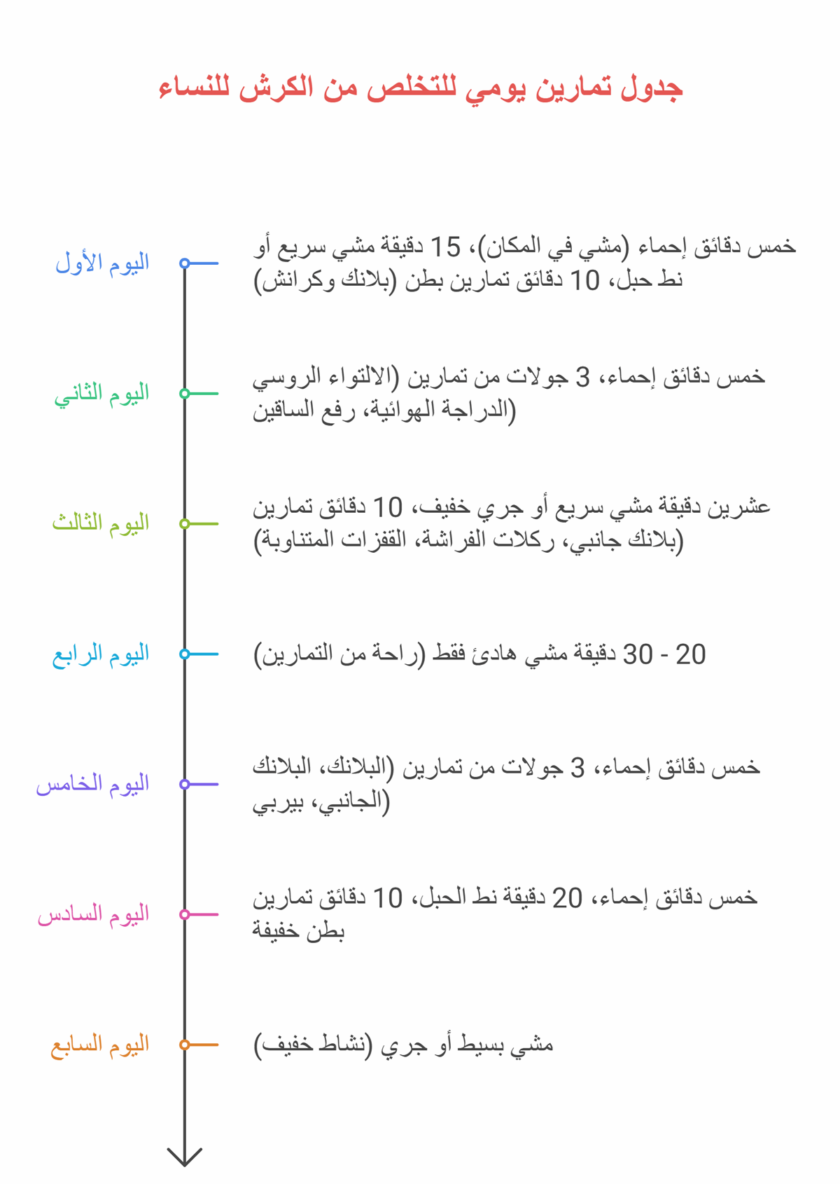 ينصح الخبراء النساء بأداء تمارين البطن من 20 إلى 30 دقيقة يوميا، لكن قد يصعب على البعض إعداد جدول تمارين يومي للتخلص من الكرش والخصر. لذا، إليك جدول تمارين أسبوعي بسيط ومتنوّع يستهدف حرق دهون البطن بشكل صحي وفعّال، كما يلي: