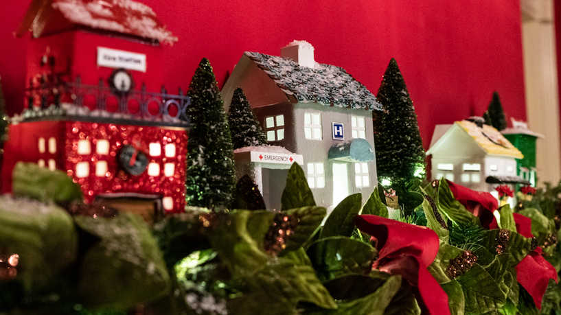 فشجرة عيد الميلاد في تلك القاعة تعرض الزخارف والزينات المصنوعة يدويًا في أشكال مثل مستشفى صغير، وشاحنة قمامة صغيرة، وقبعة ممرضة، ومعطف
