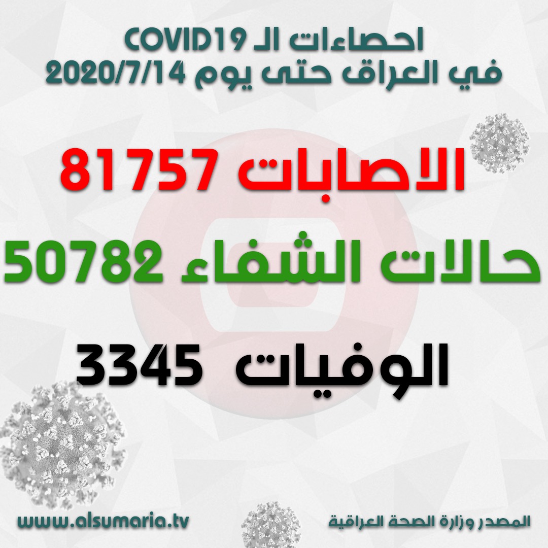 وبينت الوزارة، أن "مجموع حالات الشفاء بلغت 50782، ومجموع الإصابات 81757، أما مجموع الراقدين الكلي فقد بلغ 27630، والراقدين في العناية المركزة 396، ومجموع الوفيات 3345 حالة".