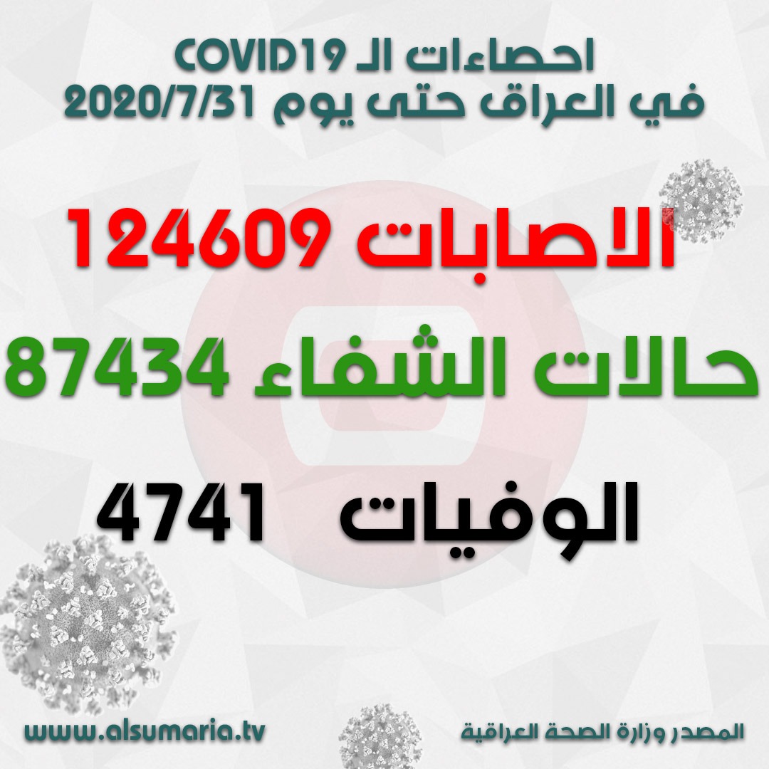 وتابع البيان أن "مجموع الشفاء: 87434 (نسبة الشفاء 70.2 %) ومجموع الاصابات: 124609، الراقدين الكلي: 32434، الراقدين في العناية المركزة: 454، مجموع الوفيات: 4741".