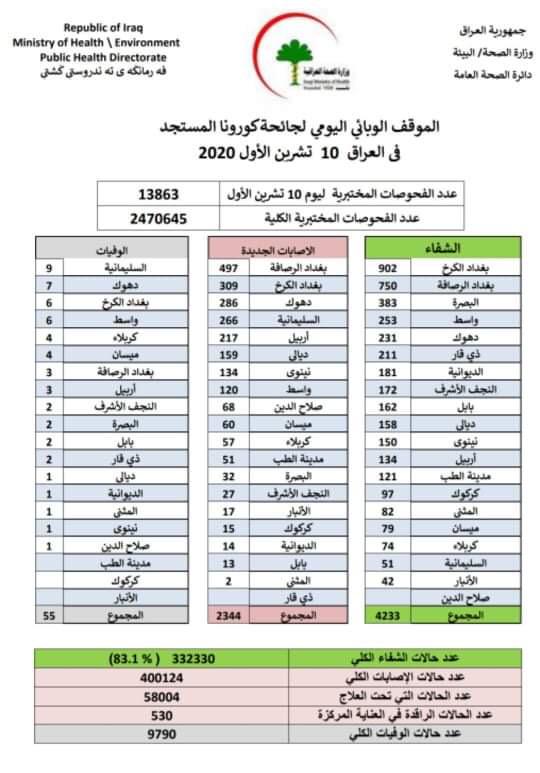 الشفاء اعلى من الاصابات.. الموقف الوبائي بشأن كورونا في العراق