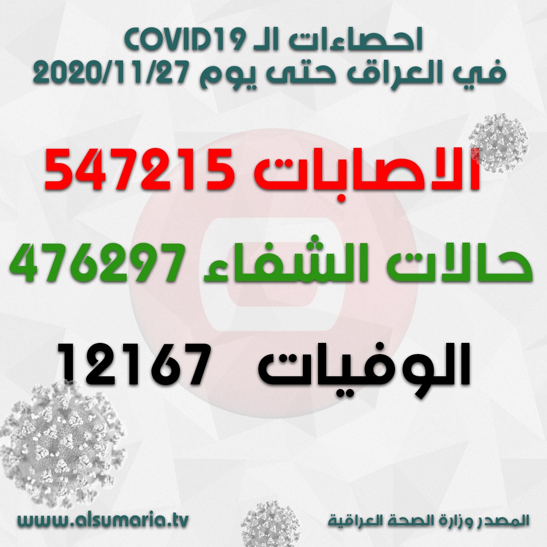 ، الجمعة، تماثل ١٩٢١ مصاب بكورونا الى الشفاء، فيما سجل عموم لعراق ٤٢ حالة وفاة جديدة و٢٥٤٥ اصابة جديدة بالفيروس.