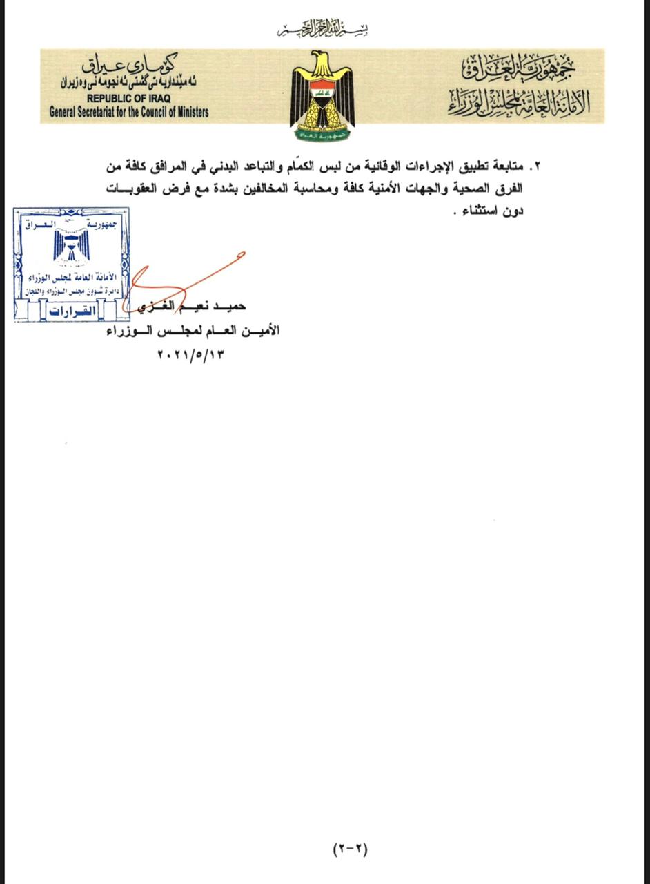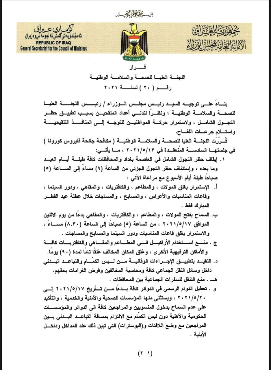 وتضمنت القرارات استئناف حظر التجوال الجزئي طيلة ايام العيد وما بعده يوميا من الساعة (9) مساء ولغاية الساعة (5) صباحا، وقرارات تتعلق بعمل المولات والمطاعم ودور السينما والاماكن التي تشهد تجمعات بشرية.