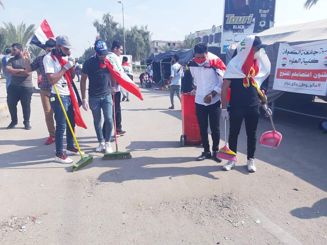 ، نفذوا، صباح اليوم، حملة لتظيف مكان الاعتصام قرب الخيم التي نصبت امام مبنى المحافظة وفي