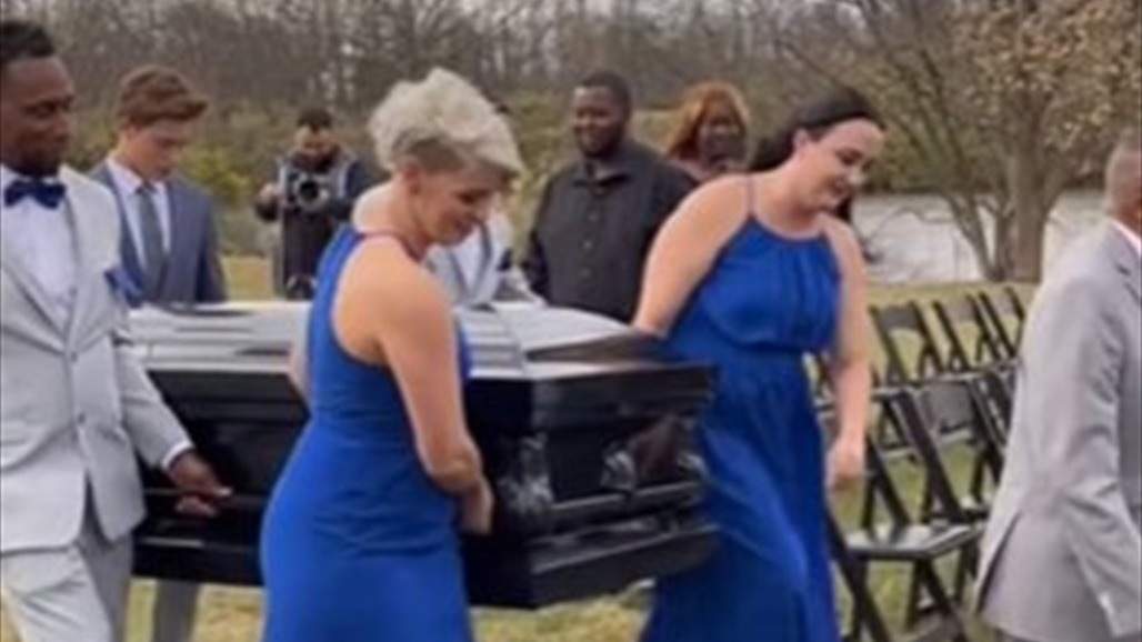 " البريطانية فإن أحد أصدقاء العريس التقط فيديو، أظهر فيه لحظة وصول العريس إلى حفل زفافه الذي أقيم الأسبوع الماضي، بتابوت أسود.