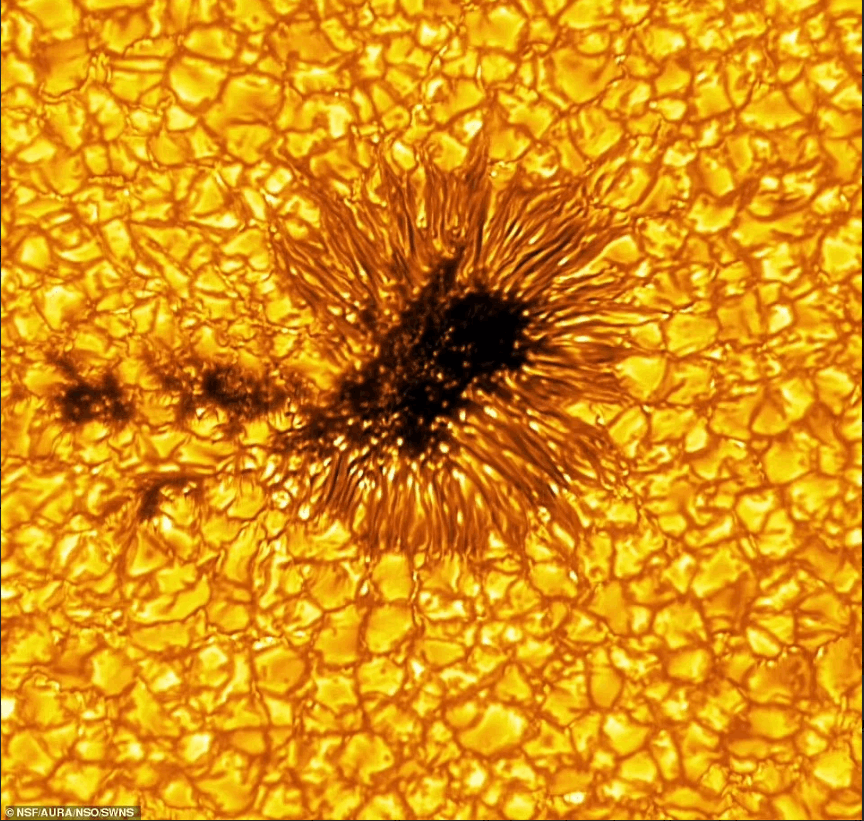 ويظهر في إحدى الصور التي التقطها التلسكوب، الذي يقع في جزيرة ماوي في هاواي، شكل لوجه غامض إلى جانب بعض البقع الشمسية التي تكبر حجم الأرض، بحسب مؤسسة العلوم الوطنية الأمريكية (NSF).