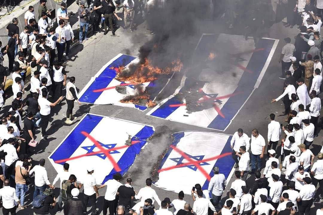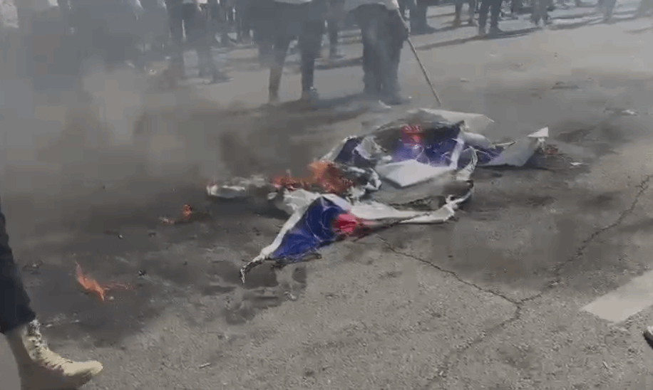 ، اليوم الجمعة 13 تشرين الأول/ أكتوبر 2023، لحظة احراق العلم الإسرائيلي في