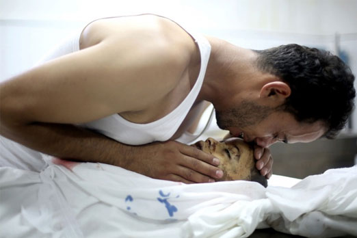5. صورة مؤثرة لشاب فلسطيني يبكي على جثة شقيقه الصغير جراء القصف الاسرائيلي على منزلهما