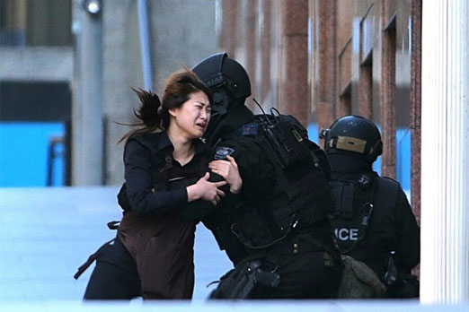 8. صورة مأخوذة من حاددثة احتجاز المقهى في مدينة سيدني الاسترالية حيث يقوم رجل من الشرطة بمساعدة احدى الرهائن .