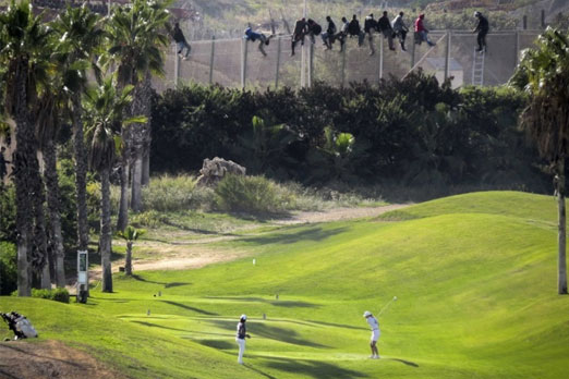 16. صورة لمهاجرين يجلسون على سياج ملعب لرياضة "الجولف" في مدينة مليلية الاسبانية ، على الحدود بين