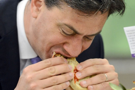 حزب العمال البريطاني إد ميلباند يأكل شطيرة من اللحم قبل ساعات من بدء الانتخابات