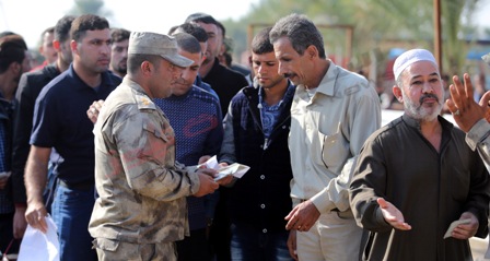 عند الطرف الآخر من الجسر ثمة المئات من النازحين ينتظرون إكمال إجراءات فحص أوراقهم الثبوتية لكي يتم بعد ذلك زجهم في حافلات تقلهم إلى العاصمة